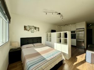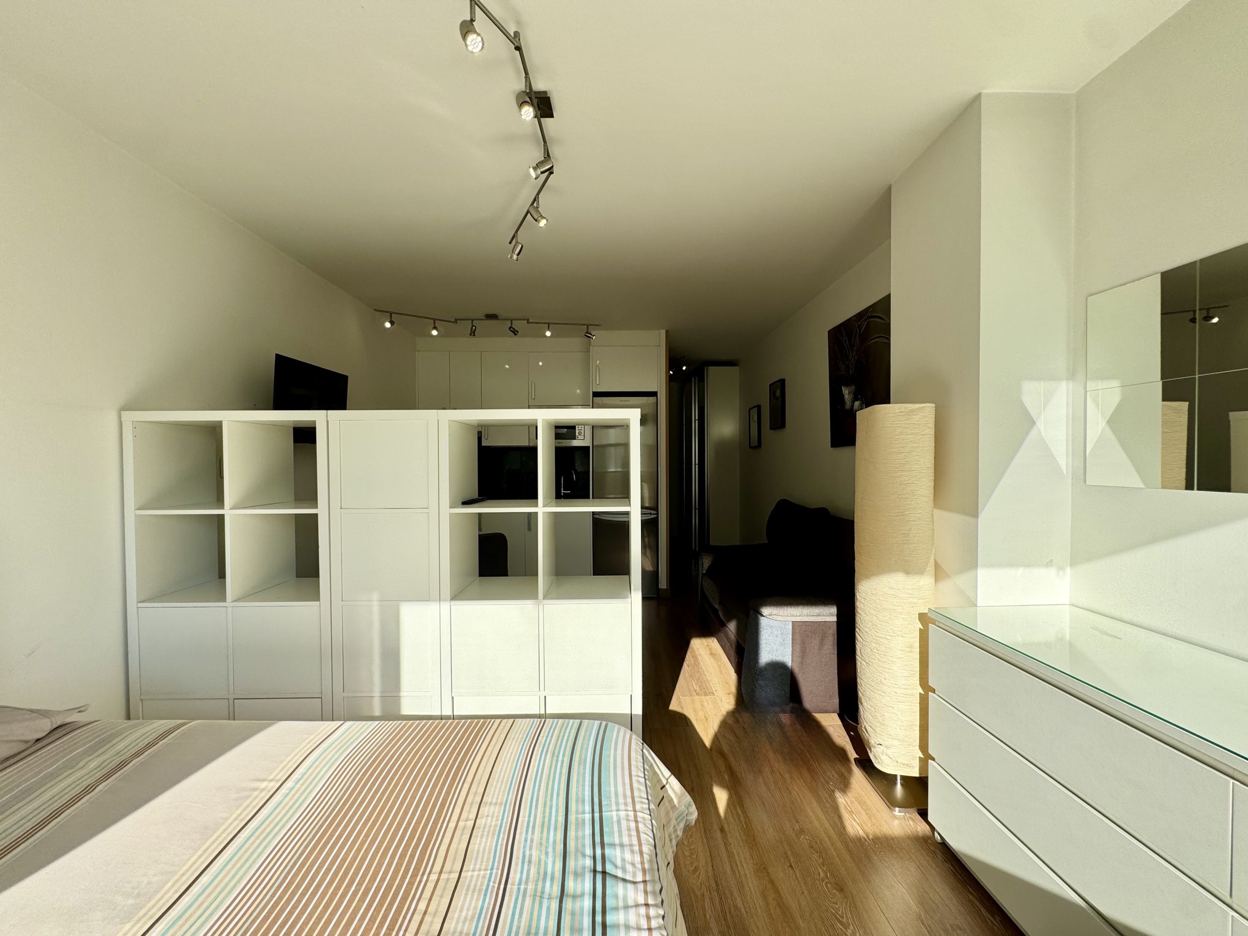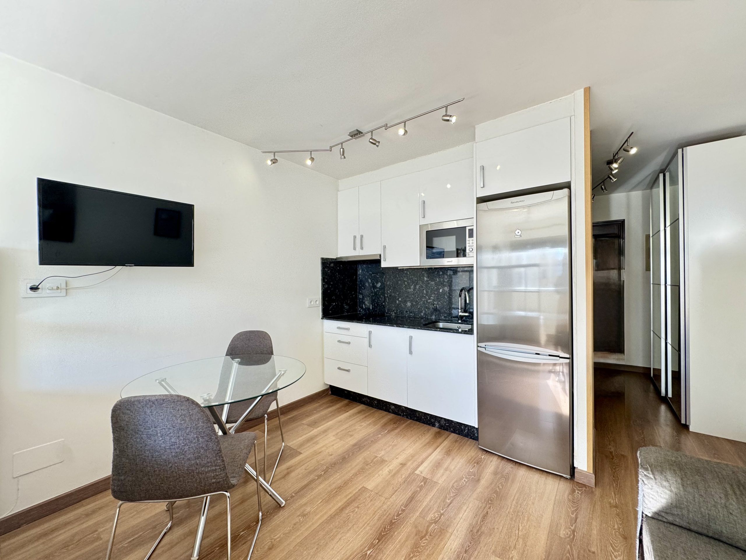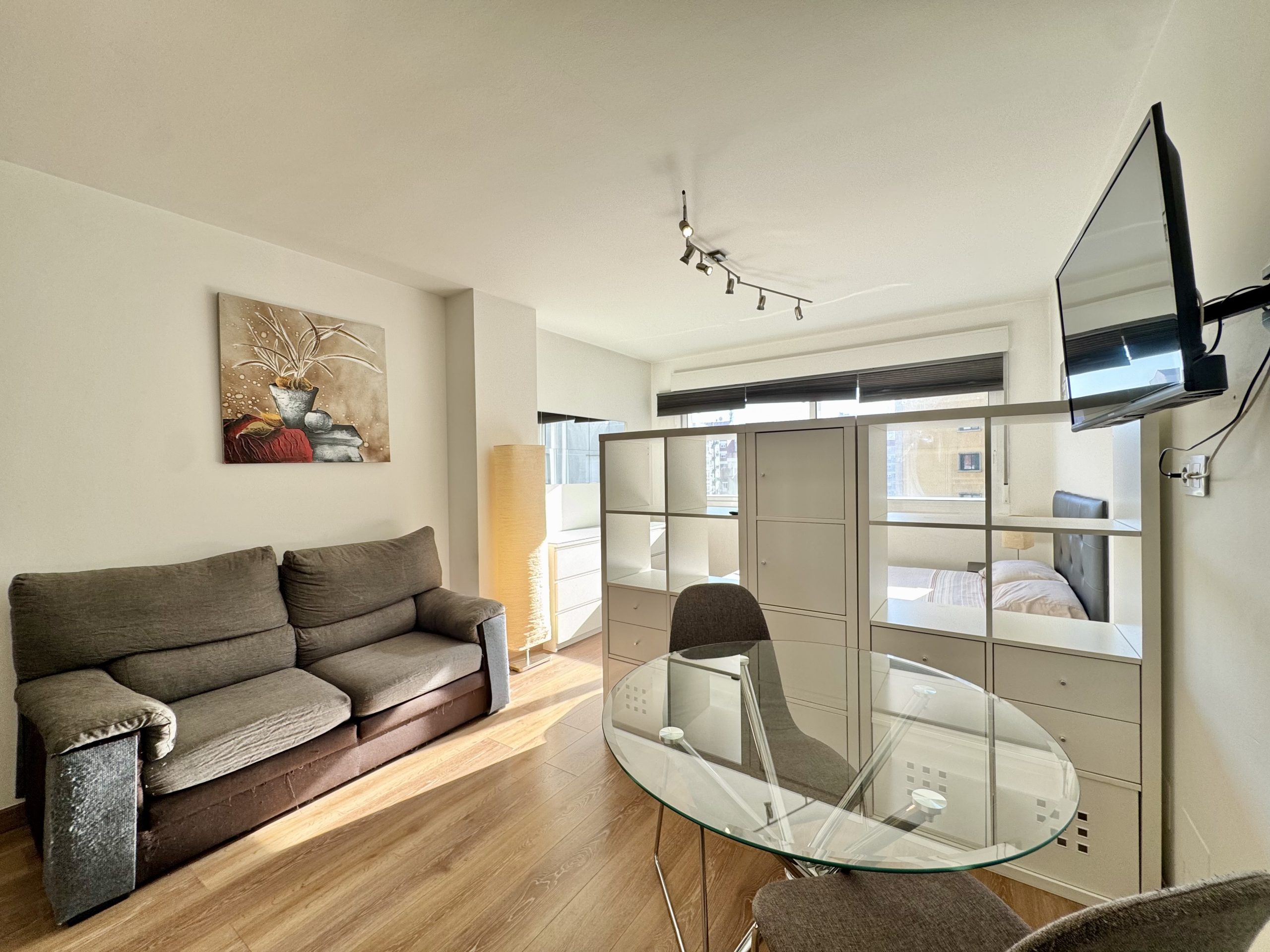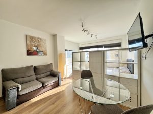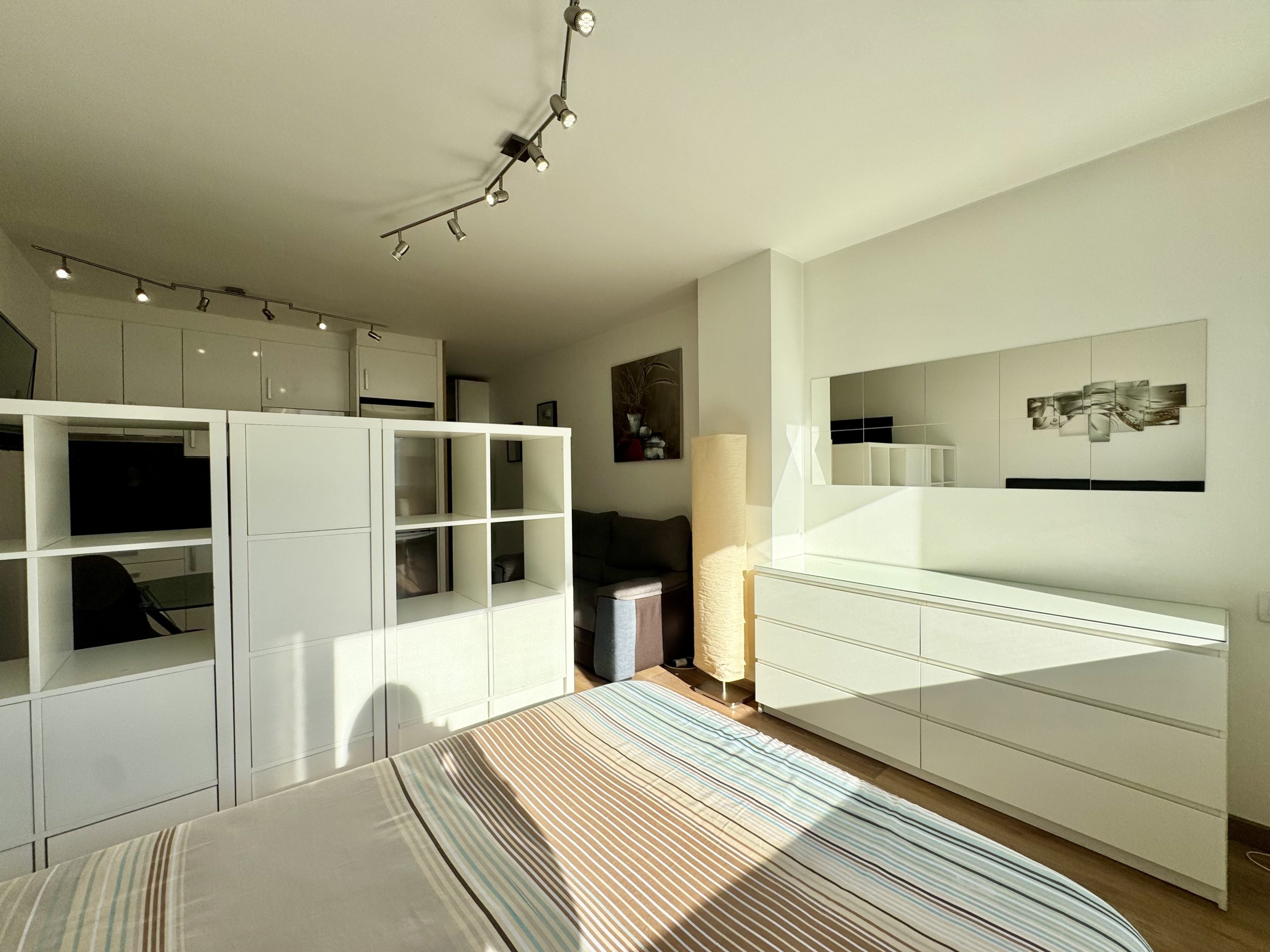 Continuando en la vivienda, accedemos a la zona de cocina y salón, un espacio abierto, cómodo y bien distribuido, perfecto para el día a día. Al fondo se encuentra la zona de descanso, que queda independizada visualmente mediante un mueble decorativo y de almacenaje, aportando intimidad sin perder luminosidad ni amplitud.