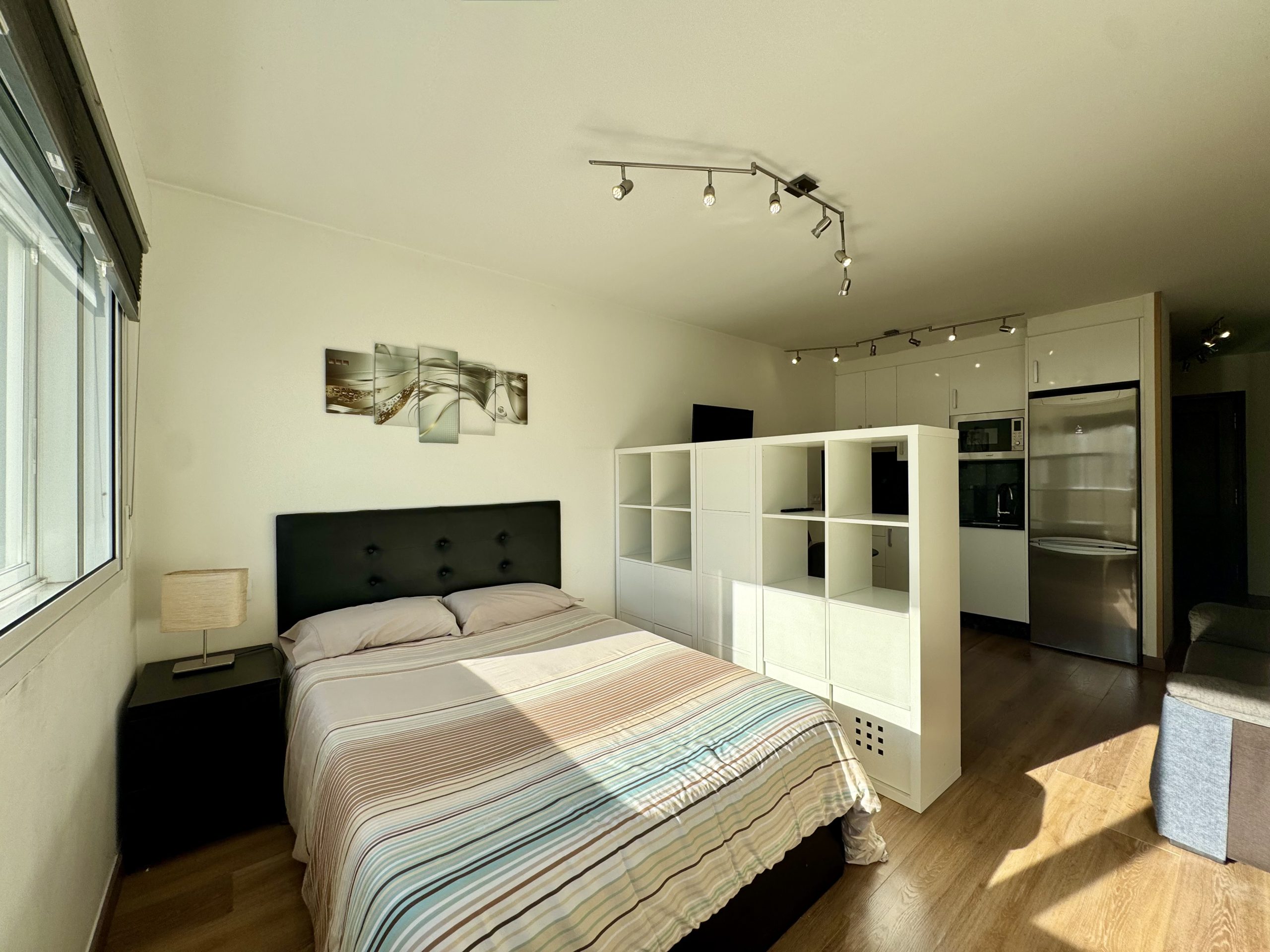 La zona de dormitorio cuenta con una cama con canapé, que ofrece un extra de almacenaje muy práctico, y una cómoda, completando así un espacio funcional y acogedor.